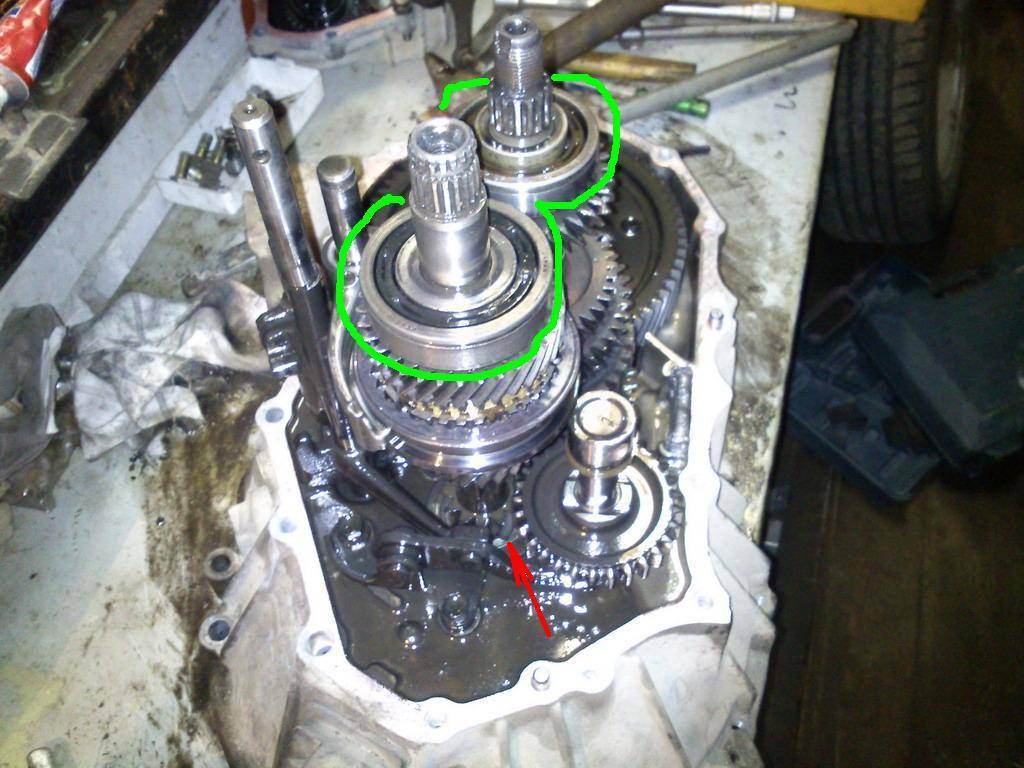 n0n7et писал(а): подшипник то купить не проблема а вот спец инструмент с помощью которого поменять незнаю где достать А какой подшипник менять-то? Передний или задний? Если передний роликовый, там специнструмент не потребуется. Вот он на фото, красной стрелочкой показан. До этого состояния коробас разбирается без специнструмента. От этого момента валы вынимаются лёгким движением рук, а под первичным в картере сидит подшипник, который выбивается (выпрессовывается) подручными материалами. Вот если задние (обведены зелёным) - без мощного съёмника не обойтись. Я ещё и внешние кольца на них колол, чтобы за внутренние потом лучше было зацепиться для стаскивания с валов. Вот так эти кольца выглядели: viewtopic.php?p=691026#p691026Погремушка из коробаса с ними хорошая была, зато после замены тишина.