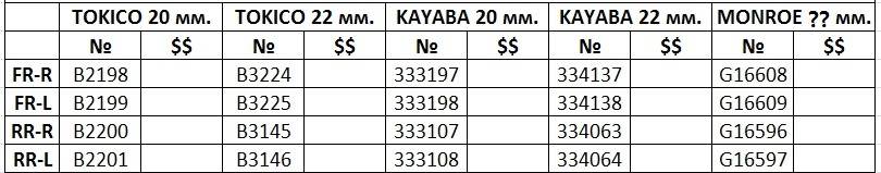 Покопался я тут, и вот что выяснил. Если исходить из того, что "пакет для плохих дорог" и версии для Ирландии - это чашка ниже и пружина длиннее(для мягкого хода подвески по колдобинам), то получается вот что: KYB-------------------------------------------------------------------------------------------------------------------TOKICO 333107 (333108) - исключая пакет для плохих дорог и версии для Ирландии - чашка выше - В2200 (В2201) 333112 (333113) - с пакетом плохие дороги и версии для Ирландии - - - - - - - чашка ниже - B3161 (B3162) ??? 334061 (334062) - с пакетом плохие дороги и версии для Ирландии - - - - - - - чашка ниже - B3161 (B3162) 334063 (334064) - исключая пакет для плохих дорог и версии для Ирландии - чашка выше - В3145 (В3146)