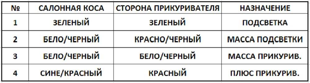 Таким образом бело-черный это 2 массы. Оранжево-зеленый - это подсветка прикуривателя Сине-желтый - это идет с АСС