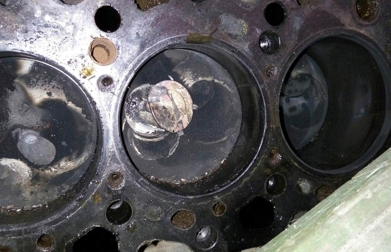 Предположу, что у Вас выпускные клапана встретились с поршнями. Сломанному клапану меньше повезло - сломался