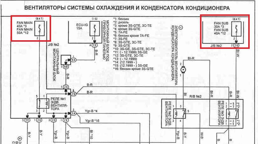 toyota_love писал(а): Над радиатором есть маленький блок реле, в нем три реле: красное и два черных, красное тоже отвечает за вентиллятор радиатора? Не знаю,может Вам чем-то поможет. На моей, слева (если стоять у капота), над радиатором стоит блок из 3-х реле, коричневый - Fan.2, чёрный - Fan.3, чёрный - MG CLT.