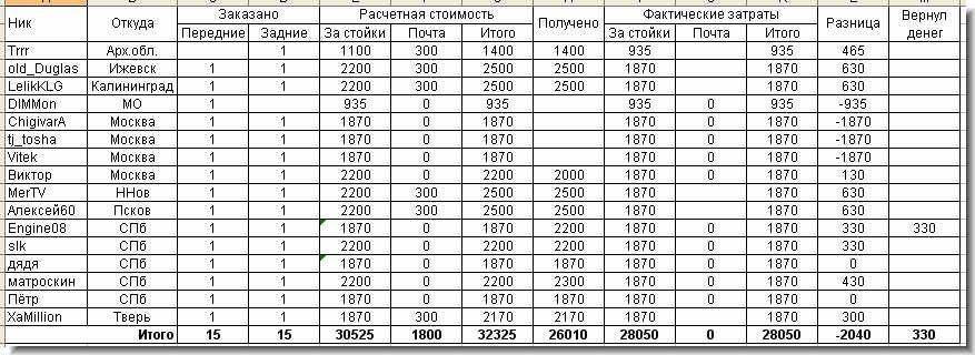 Пару задних дозаказал, но готовы будут не раньше вторника. В этой связи прошу ChigivarU, как вскочившего на подножку в последний момент, подождать чуть-чуть