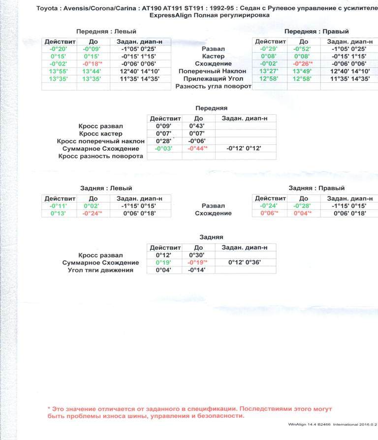 Люсик Красные- это до регулировки. Единственное красное после регулировки- это схождение правого заднего колеса. 0.06, но это не критично, граница нормы 0.06-0.18