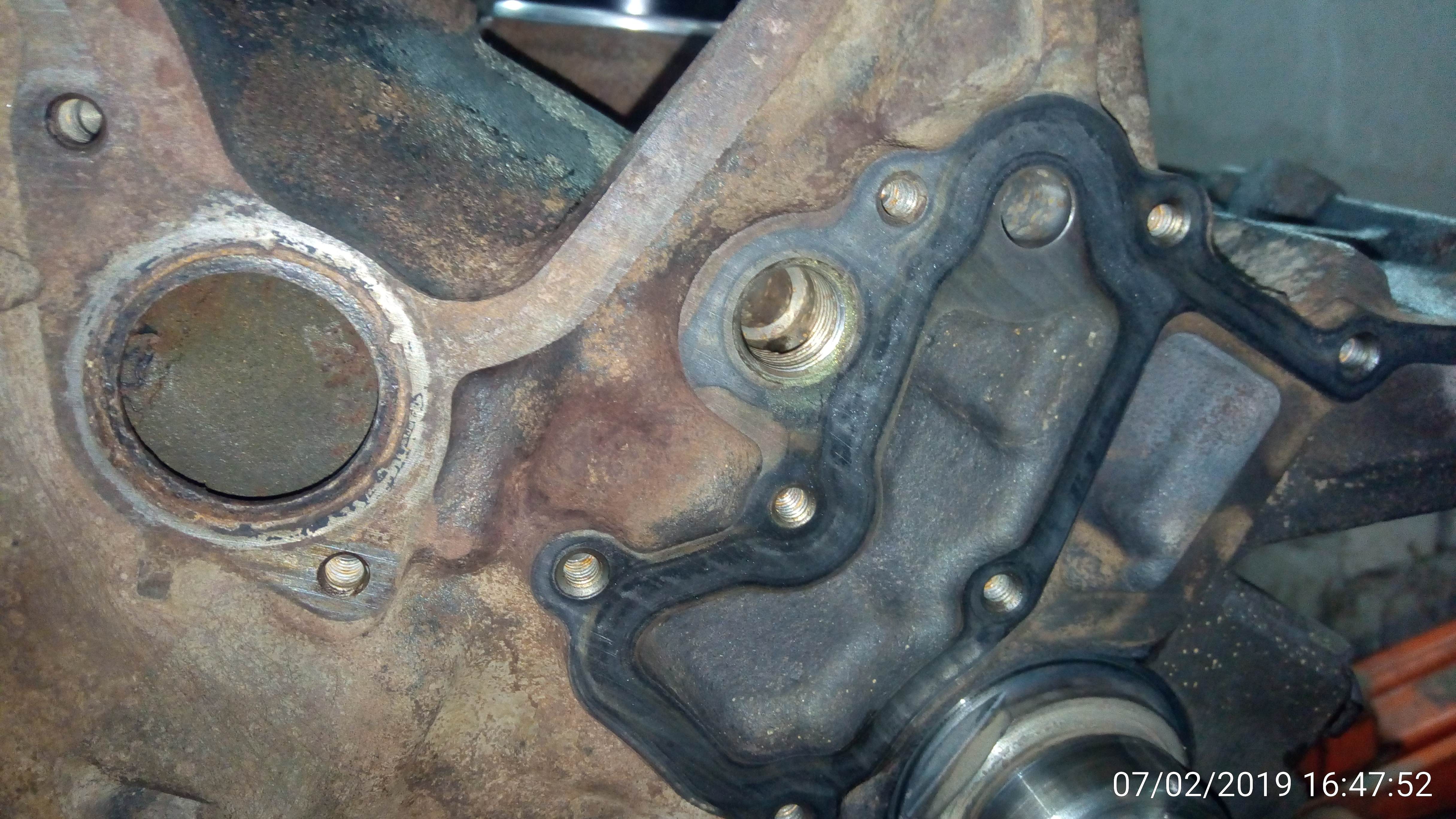 Жалобы на чрезмерный жор масла и попадание газов в рубашку охлаждения. Попутный осмотр показал кучу сопливостей по всему двигателю и течь масла с заднего сальника коленвала. Решено было снять двигатель для полной разборки,дефектовки и ремонта Сразу же было обнаружено отверстие сделанное предыдушими ремонтниками-рацианализаторами. Для стопорения коленвала видимо при замене ремня ГРМ  Вложение:
