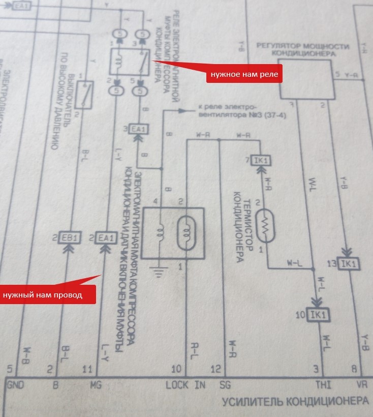 и О ЧУДО кондей работает все запускается карлсоны крутятся, воздух в салоне хоть мороженное храни, но это ж не по феншую. понимаю что управление реле включения муфты происходит по минусу, соответственно ищем куда делся этот пресловутый минус 4. Открываем электросхему кондиционера и изучаем Вложение: