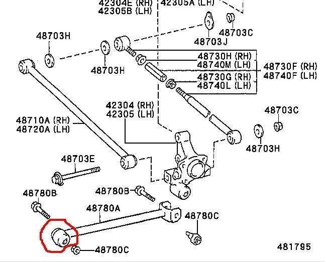 вообще мне нужно поменять вот этот сайлент(на рис.),раз этот рычаг трогать,думаю и в кулаке нужно поменять.хотя он вроде целый.или лучше не трогать его? как я понял для кулака вот такой сайлент: RBI T25281 или Japan car J52000A. для передней подвески сайлентами затарился.осталось с задними разобраться,чтоб потом схождение 2 раза не делать