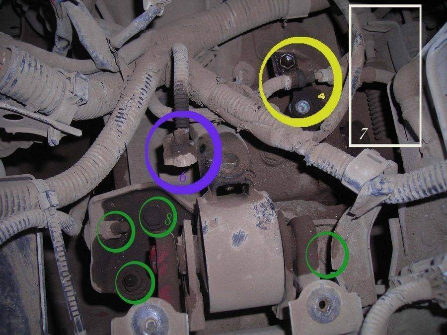 Вроде все. Теперь откручиваем сверху крепление коробки к левой подушке и вывешиваем двигатель (мы подставляли доску под движок). Рис.2 - зеленый